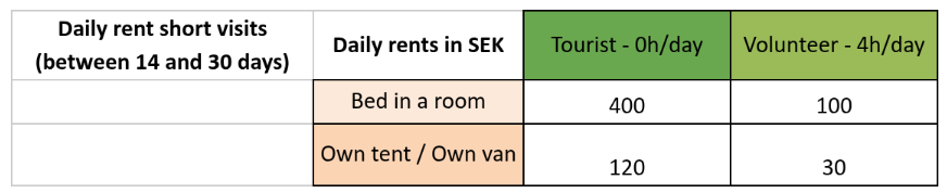 “Volunteers” (visitors that work with us an average of 20h/week) have a discount compared to “tourists” (visitors that don’t participate to the communal work). You can see at the bottom of this page what is considered as a working hour.